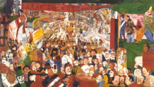 James Ensor ist am meisten bekannt für seine Bilder von Masken und Skeletten und wegen seines monumentalen Bildes von 1888, "Der Einzug Christi in Brüssel" (jetzt im J. Paul Getty Museum in Malibu, California). Dieses Werk wurde oft als Ensors Antwort auf Seurats "La Grande Jatte" ("Ein Sonntagnachmittag auf der Insel Grande Jatte") angesehen, welches im vorhergehenden Jahr bei der progressiven Ausstellungsgesellschaft "Les XX" ("Die Zwanzig") gezeigt wurde. In Ensors Gemälde "Der Einzug Christi in Brüssel", und in den meisten seiner biblischen Bilder (einschließlich "Christi Höllenfahrt", die hier zu sehen ist), ist wenig Zweifel, daß die Figur Christi ein Selbstporträt des Künstlers ist. Diese Ansicht wird ausführlich in Stephen McGoughs Studie untersucht [A9] .